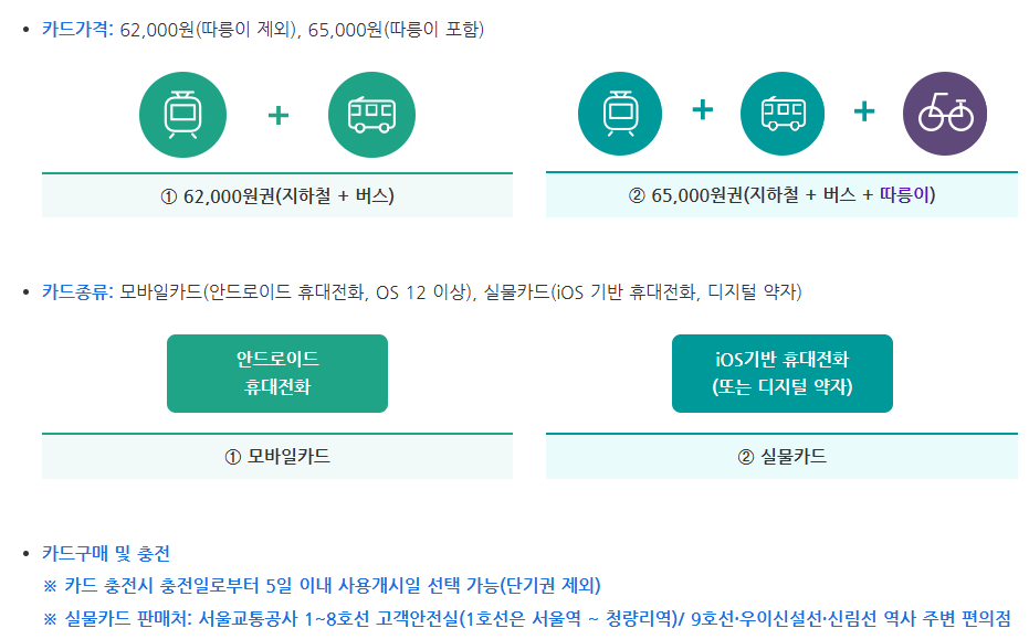 기후동행카드는 1회 요금 충전으로 30일간 대중교통 (지하철, 버스), 따릉이를 무제한 이용할 수 있는 대중교통 통합 정기권입니다. 이 카드는 서울 지역 지하철과 김포골드라인, 서울시 면허 시내·마을버스, 그리고 따릉이를 이용할 수 있습니다. 다만, 신분당선, 서울 지역 외 지하철, 광역/공항버스, 타 지역 면허버스는 제외됩니다. 버스의 경우 서울시 면허 버스는 서울 지역 외에서 승하차하더라도 기후동행카드를 사용할 수 있습니다. 기후동행카드는 시범사업을 거쳐 본사업으로 전환되었으며, 가격은 따릉이를 제외한 62,000원과 따릉이를 포함한 65,000원 두 가지 종류가 있습니다. 카드는 모바일카드와 실물카드로 구매할 수 있으며, 서비스 범위와 사용 방법에 대한 자세한 내용은 여기에서 확인하실 수 있습니다