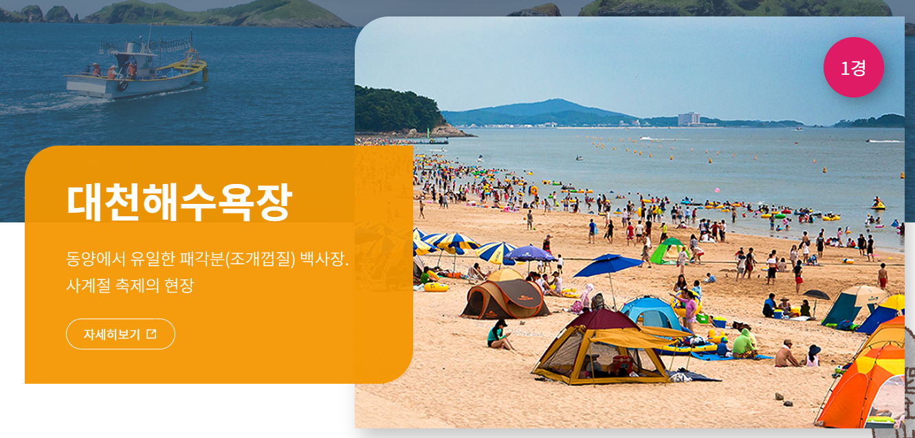 끝없이 이어진 하얀 백사장, 파란 바다, 수평선 너머 점점이 떠 있는 작고 큰 섬들, 원색의 수영복 물결, 햇살을 가릴 만한 넉넉한 솔숲, 수평선 너머 아득히 떨어지는 낙조.... 대천해수욕장은 젊음과 낭만, 안락함과 자연미가 함께 어우러져 있는 곳이다. 젊은 연인들에게는 추억 만들기의 장소로서, 또 가족 단위의 휴식처로서, 해양스포츠의 메카로서 제반 요건을 충분히 갖추고 있다.