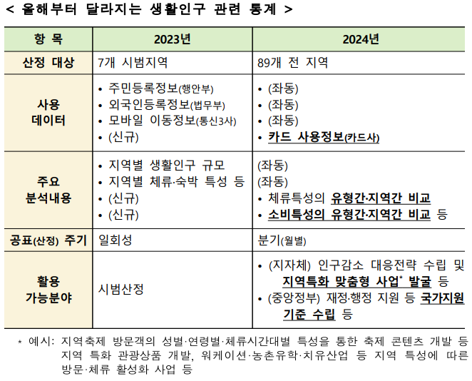 2024년 부터 달라지는 생활인구 통계관련 내용을 알아보고 통계를 활용해 사업에 활용해 보시면 많은 도움이 되실 수 있을 거라 생각이됩니다.