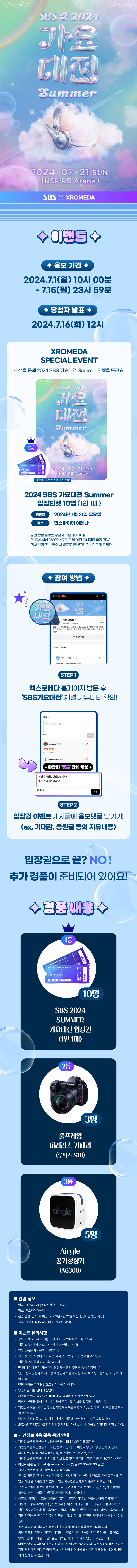 2024 뜨거운 여름, 무더위를 날려줄 K-POP 오아시스 New Generation POP Summer Festival 1. 2024 SBS 가요대전 Summer Live Streaming, (07.08, TICKET OPEN) 2. XROMEDA Special EVENT (07.01 ~ 07.15) 커뮤니티 게시글을 확인하세요. (Ch
