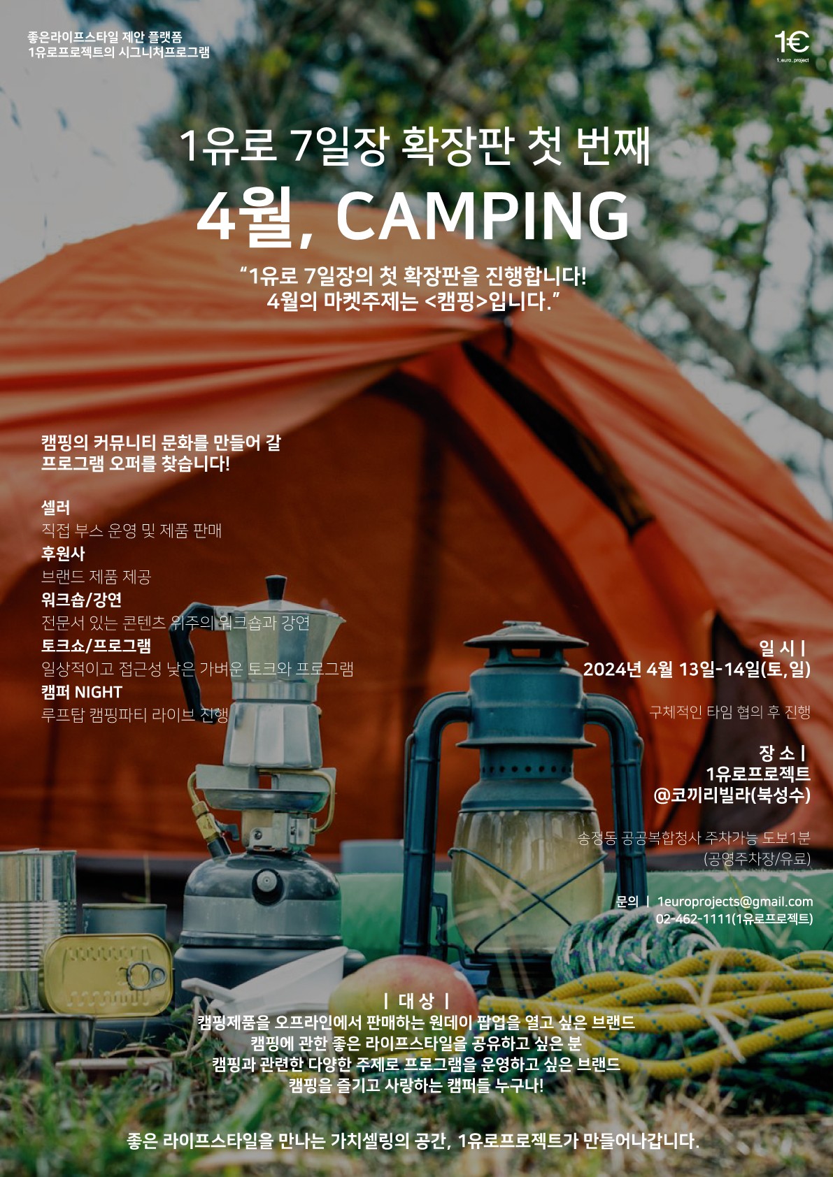 1유로프로젝트라는 곳에서 캠핑 축제를 마련했다. 1유로프로젝트의 시그니처 프로그램, 7일장의 첫번째 확장판 4월의 주제 ‘캠핑’플리마켓을 엽니다. 1유로프로젝트는 좋은 라이프스타일을 찾는 사람들을 위한 유무형 플랫폼입니다. 소설 디벨로퍼 아키텍트 그룹인 Lokaal Futures(오래된미래 공간연구소)가 순수 민간주도의 도시상생 프로젝트를 진행하고 있습니다.